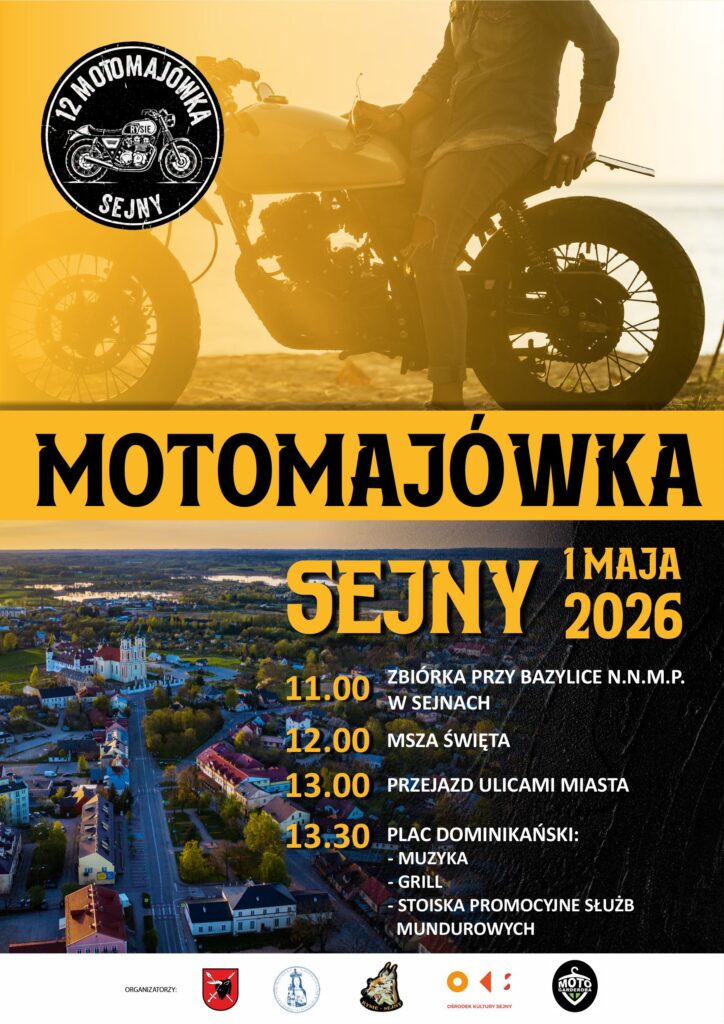 Sejny ponownie staną się miejscem spotkania miłośników dwóch kółek. 1 maja 2026 r. odbędzie się 12. edycja Motomajówki – cyklicznego wydarzenia, które z roku na rok przyciąga coraz większą liczbę uczestników i na stałe wpisało się w kalendarz lokalnych inicjatyw.